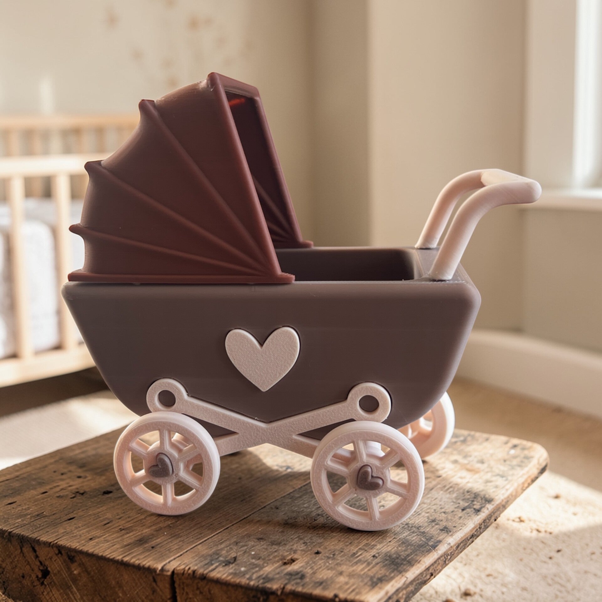 Ideal zum Befüllen mit Süßigkeiten, Geldgeschenken oder kleinen Erinnerungsstücken. Auch nach dem Verschenken bleibt der Kinderwagen eine schöne Dekoration.